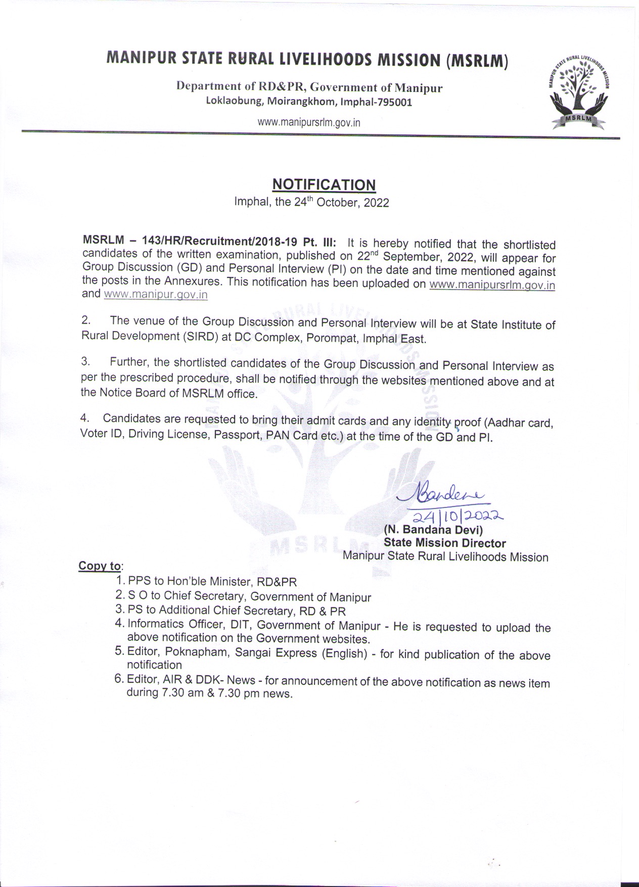 Shortlisted candidates for Group Discussion and Personal Interview w.r.t. engagement of various post of MSRLM